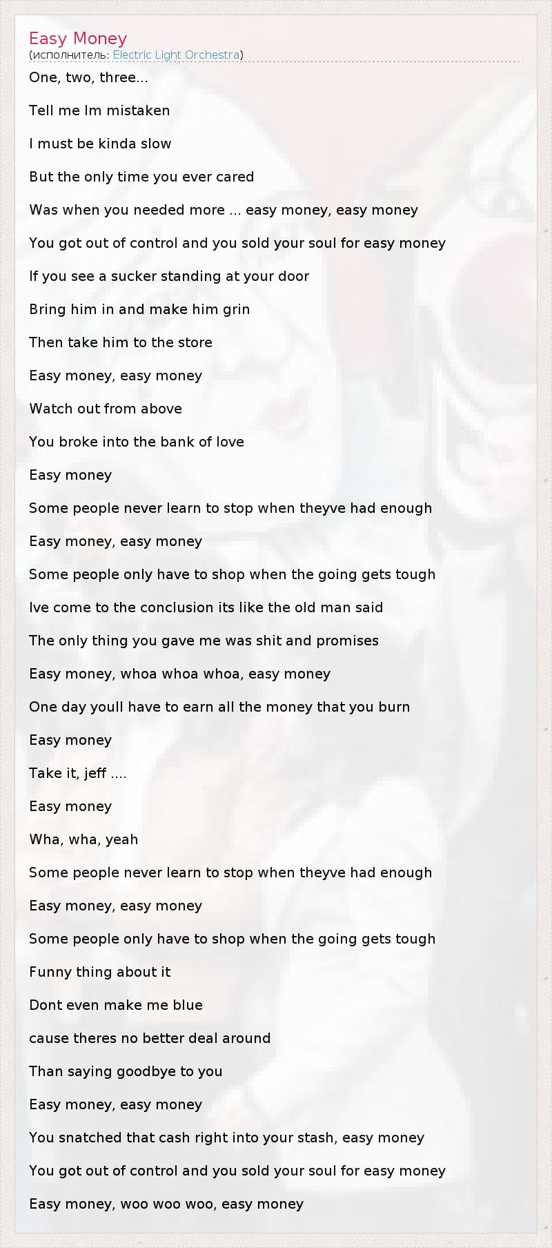 One, two, three... Tell me Im mistaken I must be kinda slow But the only time you ever cared Was when you needed more ... easy money, easy money You got out of control and you sold your soul for easy money If you see a sucker standing at your door Bring him in and make him grin Then take him to the store Easy money, easy money Watch out from above You broke into the bank of love Easy money Some people never learn to stop when theyve had enough Easy money, easy money Some people only have to shop when the going gets tough Ive come to the conclusion its like the old man said The only thing you gave me was shit and promises Easy money, whoa whoa whoa, easy money One day youll have to earn all the money that you burn Easy money Take it, jeff .... Easy money Wha, wha, yeah Some people never learn to stop when theyve had enough Easy money, easy money Some people only have to shop when the going gets tough Funny thing about it Dont even make me blue cause theres no better deal around Than saying goodbye to you Easy money, easy money You snatched that cash right into your stash, easy money You got out of control and you sold your soul for easy money Easy money, woo woo woo, easy money
