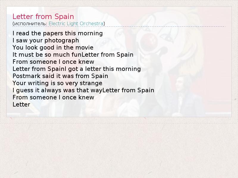 I read the papers this morning I saw your photograph You look good in the movie It must be so much funLetter from Spain From someone I once knew Letter from SpainI got a letter this morning Postmark said it was from Spain Your writing is so very strange I guess it always was that wayLetter from Spain From someone I once knew Letter