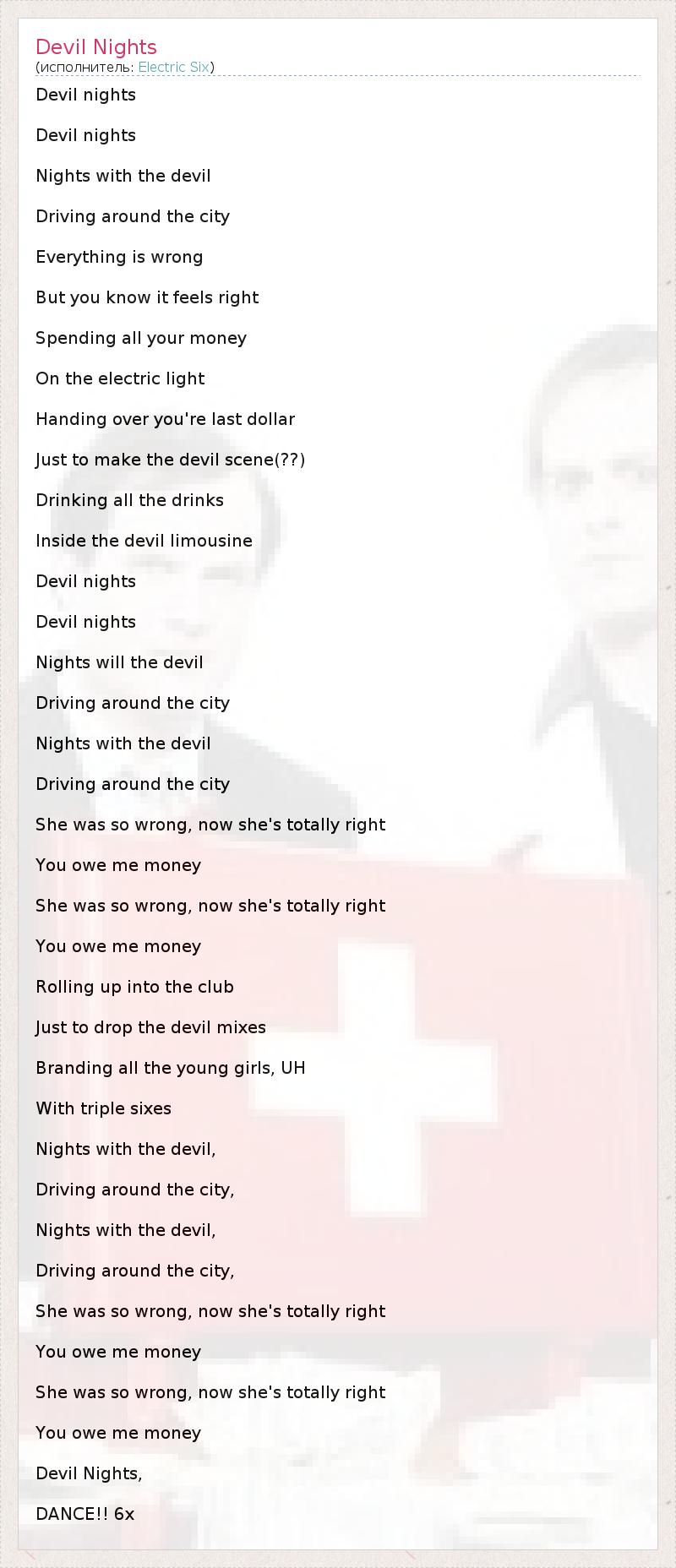Devil nights Devil nights Nights with the devil Driving around the city Everything is wrong But you know it feels right Spending all your money On the electric light Handing over you're last dollar Just to make the devil scene(??) Drinking all the drinks Inside the devil limousine Devil nights Devil nights Nights will the devil Driving around the city Nights with the devil Driving around the city She was so wrong, now she's totally right You owe me money She was so wrong, now she's totally right You owe me money Rolling up into the club Just to drop the devil mixes Branding all the young girls, UH With triple sixes Nights with the devil, Driving around the city, Nights with the devil, Driving around the city, She was so wrong, now she's totally right You owe me money She was so wrong, now she's totally right You owe me money Devil Nights, DANCE!! 6x