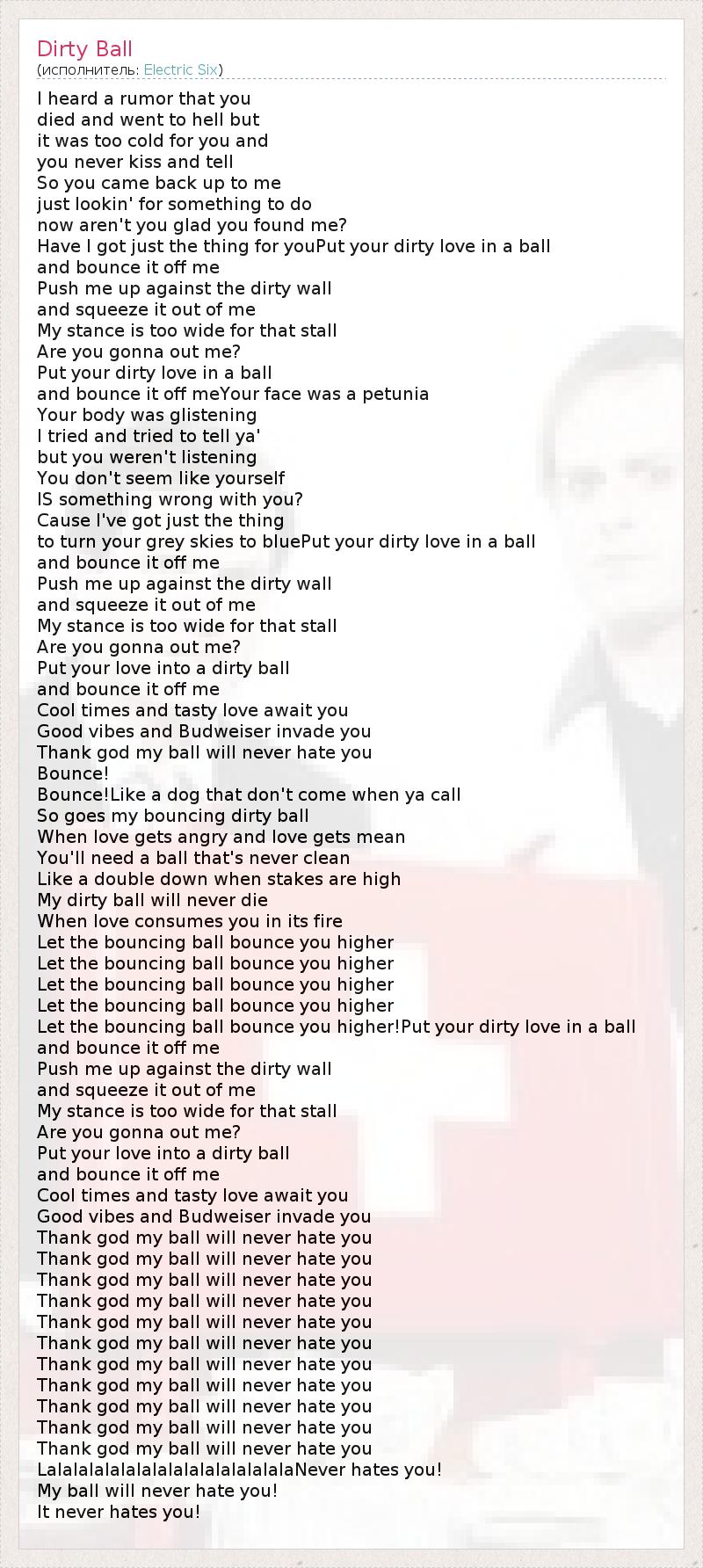 I heard a rumor that you died and went to hell but it was too cold for you and you never kiss and tell So you came back up to me just lookin' for something to do now aren't you glad you found me? Have I got just the thing for youPut your dirty love in a ball and bounce it off me Push me up against the dirty wall and squeeze it out of me My stance is too wide for that stall Are you gonna out me? Put your dirty love in a ball and bounce it off meYour face was a petunia Your body was glistening I tried and tried to tell ya' but you weren't listening You don't seem like yourself IS something wrong with you? Cause I've got just the thing to turn your grey skies to bluePut your dirty love in a ball and bounce it off me Push me up against the dirty wall and squeeze it out of me My stance is too wide for that stall Are you gonna out me? Put your love into a dirty ball and bounce it off me Cool times and tasty love await you Good vibes and Budweiser invade you Thank god my ball will never hate you Bounce! Bounce!Like a dog that don't come when ya call So goes my bouncing dirty ball When love gets angry and love gets mean You'll need a ball that's never clean Like a double down when stakes are high My dirty ball will never die When love consumes you in its fire Let the bouncing ball bounce you higher Let the bouncing ball bounce you higher Let the bouncing ball bounce you higher Let the bouncing ball bounce you higher Let the bouncing ball bounce you higher!Put your dirty love in a ball and bounce it off me Push me up against the dirty wall and squeeze it out of me My stance is too wide for that stall Are you gonna out me? Put your love into a dirty ball and bounce it off me Cool times and tasty love await you Good vibes and Budweiser invade you Thank god my ball will never hate you Thank god my ball will never hate you Thank god my ball will never hate you Thank god my ball will never hate you Thank god my ball will never hate you Thank god my ball will never hate you Thank god my ball will never hate you Thank god my ball will never hate you Thank god my ball will never hate you Thank god my ball will never hate you Thank god my ball will never hate you LalalalalalalalalalalalalalalalaNever hates you! My ball will never hate you! It never hates you!