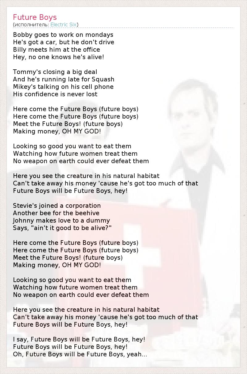 *Future Boys will be Future Boys - обыгрывается Фразеологизм "boys will be boys"("мальчики есть мальчики")