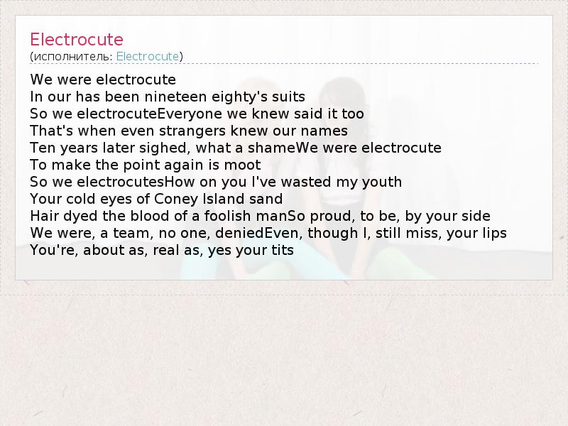 We were electrocute In our has been nineteen eighty's suits So we electrocuteEveryone we knew said it too That's when even strangers knew our names Ten years later sighed, what a shameWe were electrocute To make the point again is moot So we electrocutesHow on you I've wasted my youth Your cold eyes of Coney Island sand Hair dyed the blood of a foolish manSo proud, to be, by your side We were, a team, no one, deniedEven, though I, still miss, your lips You're, about as, real as, yes your tits