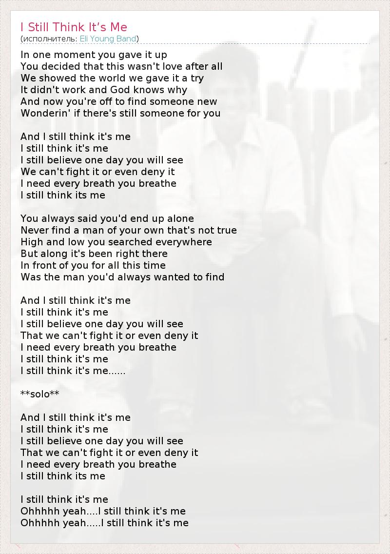 In one moment you gave it up You decided that this wasn't love after all We showed the world we gave it a try It didn't work and God knows why And now you're off to find someone new Wonderin' if there's still someone for you And I still think it's me I still think it's me I still believe one day you will see We can't fight it or even deny it I need every breath you breathe I still think its me You always said you'd end up alone Never find a man of your own that's not true High and low you searched everywhere But along it's been right there In front of you for all this time Was the man you'd always wanted to find And I still think it's me I still think it's me I still believe one day you will see That we can't fight it or even deny it I need every breath you breathe I still think it's me I still think it's me...... **solo** And I still think it's me I still think it's me I still believe one day you will see That we can't fight it or even deny it I need every breath you breathe I still think its me I still think it's me Ohhhhh yeah....I still think it's me Ohhhhh yeah.....I still think it's me