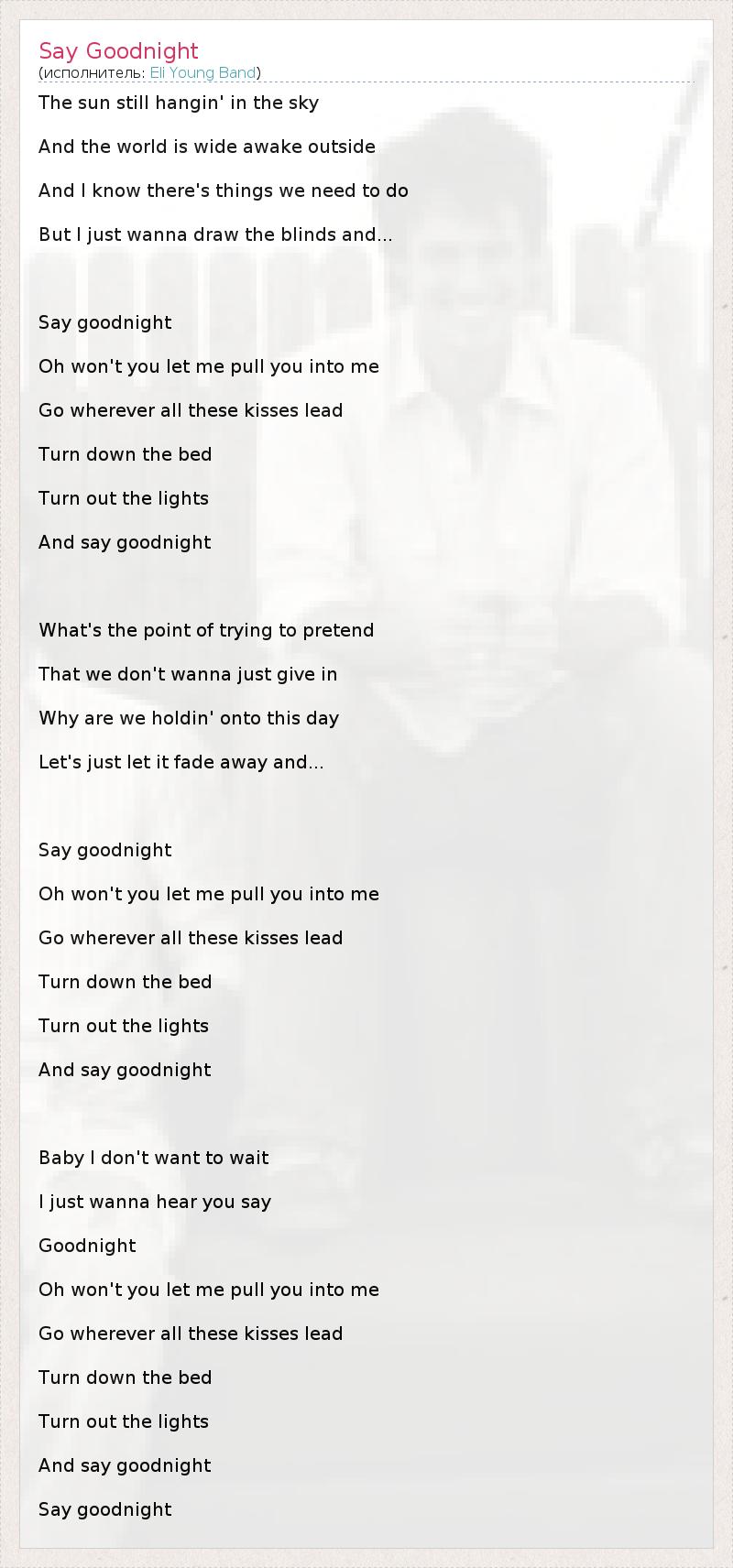The sun still hangin' in the sky And the world is wide awake outside And I know there's things we need to do But I just wanna draw the blinds and... Say goodnight Oh won't you let me pull you into me Go wherever all these kisses lead Turn down the bed Turn out the lights And say goodnight What's the point of trying to pretend That we don't wanna just give in Why are we holdin' onto this day Let's just let it fade away and... Say goodnight Oh won't you let me pull you into me Go wherever all these kisses lead Turn down the bed Turn out the lights And say goodnight Baby I don't want to wait I just wanna hear you say Goodnight Oh won't you let me pull you into me Go wherever all these kisses lead Turn down the bed Turn out the lights And say goodnight Say goodnight
