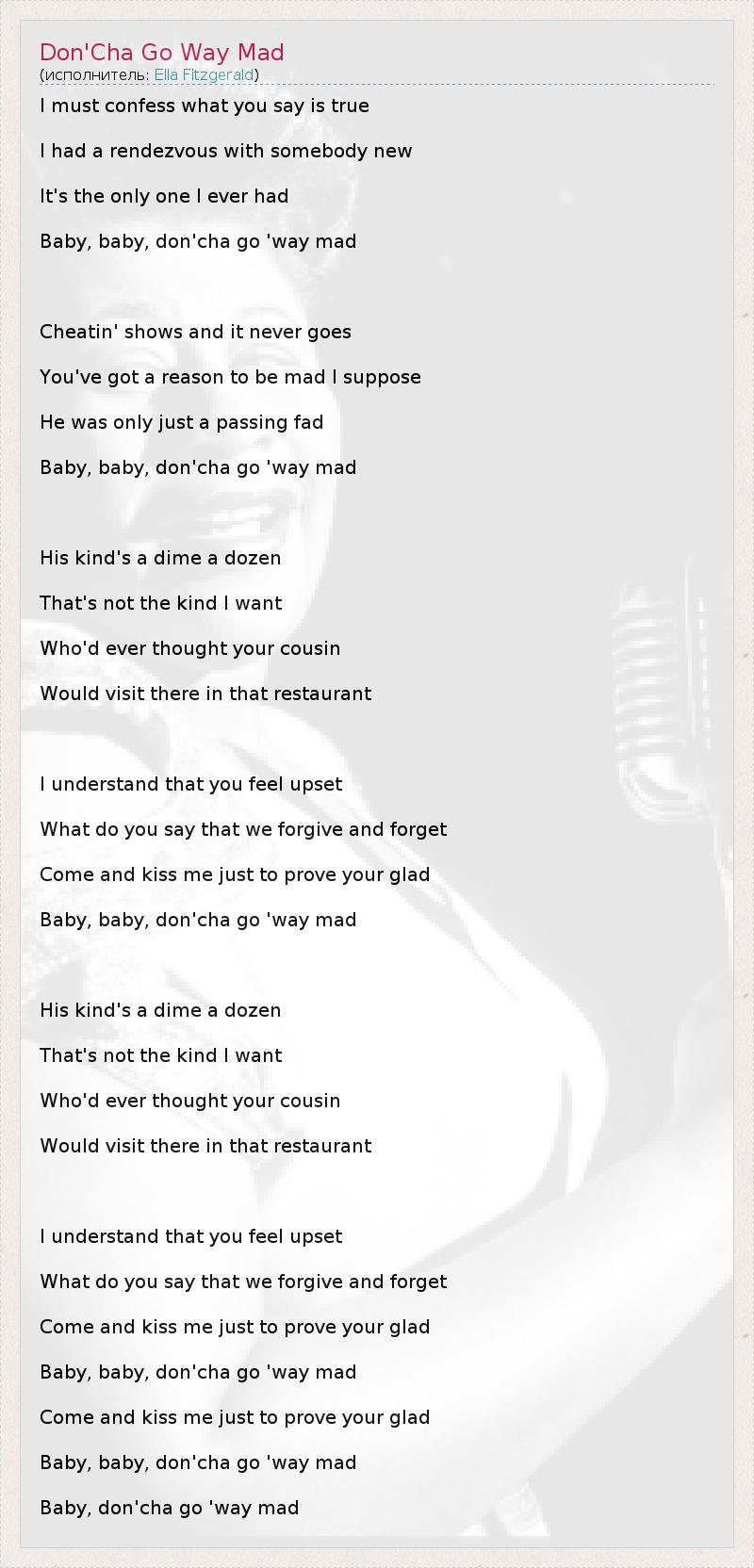 I must confess what you say is true I had a rendezvous with somebody new It's the only one I ever had Baby, baby, don'cha go 'way mad Cheatin' shows and it never goes You've got a reason to be mad I suppose He was only just a passing fad Baby, baby, don'cha go 'way mad His kind's a dime a dozen That's not the kind I want Who'd ever thought your cousin Would visit there in that restaurant I understand that you feel upset What do you say that we forgive and forget Come and kiss me just to prove your glad Baby, baby, don'cha go 'way mad His kind's a dime a dozen That's not the kind I want Who'd ever thought your cousin Would visit there in that restaurant I understand that you feel upset What do you say that we forgive and forget Come and kiss me just to prove your glad Baby, baby, don'cha go 'way mad Come and kiss me just to prove your glad Baby, baby, don'cha go 'way mad Baby, don'cha go 'way mad