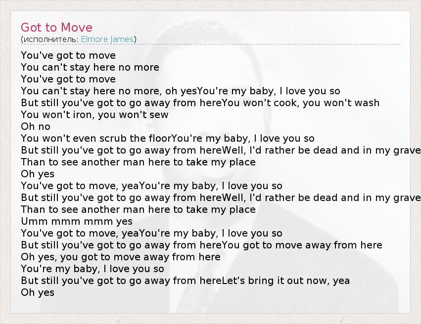Это интересно:Элмор Джеймс (англ. Elmore James; 27 января 1918 — 24 мая 1963) — американский блюзовый гитарист, певец, автор песен. Первооткрыватель техники игры слайдом на электрогитаре; один из наиболее выдающихся музыкантов эпохи расцвета чикагского блюза, чьи новации оказали огромное влияние и на дальнейшее развитие блюза, и на формирование рок-музыки.Ученик Роберта Джонсона, его часто называют самым... продолжение