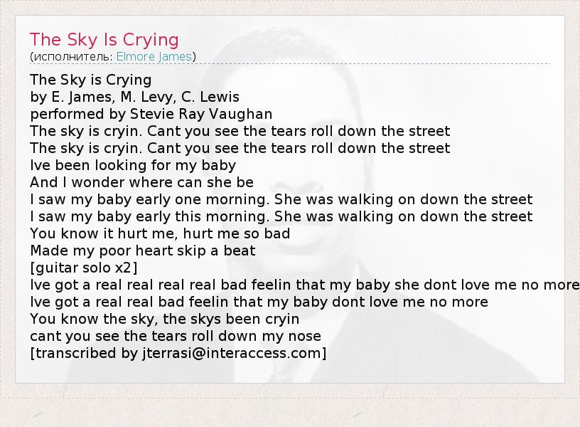 The Sky is Crying by E. James, M. Levy, C. Lewis performed by Stevie Ray Vaughan The sky is cryin. Cant you see the tears roll down the street The sky is cryin. Cant you see the tears roll down the street Ive been looking for my baby And I wonder where can she be I saw my baby early one morning. She was walking on down the street I saw my baby early this morning. She was walking on down the street You know it hurt me, hurt me so bad Made my poor heart skip a beat [guitar solo x2] Ive got a real real real real bad feelin that my baby she dont love me no more Ive got a real real bad feelin that my baby dont love me no more You know the sky, the skys been cryin cant you see the tears roll down my nose [transcribed by jterrasi@interaccess.com]