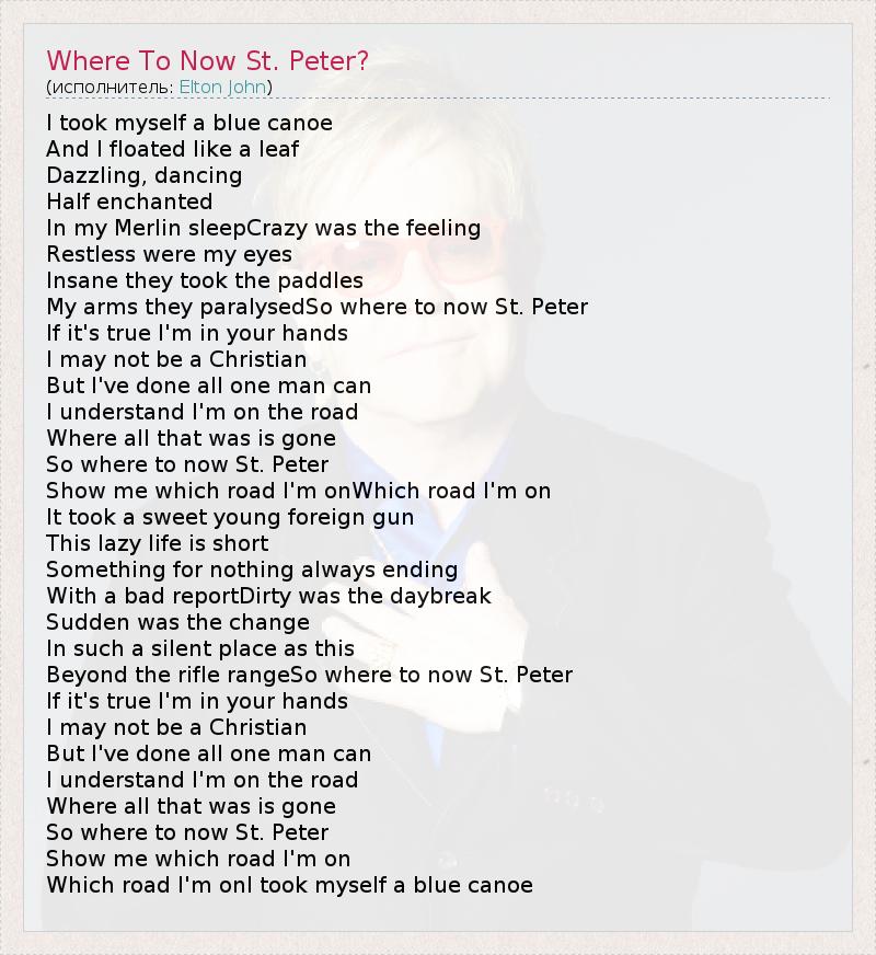 I took myself a blue canoe And I floated like a leaf Dazzling, dancing Half enchanted In my Merlin sleepCrazy was the feeling Restless were my eyes Insane they took the paddles My arms they paralysedSo where to now St. Peter If it's true I'm in your hands I may not be a Christian But I've done all one man can I understand I'm on the road Where all that was is gone So where to now St. Peter Show me which road I'm onWhich road I'm on It took a sweet young foreign gun This lazy life is short Something for nothing always ending With a bad reportDirty was the daybreak Sudden was the change In such a silent place as this Beyond the rifle rangeSo where to now St. Peter If it's true I'm in your hands I may not be a Christian But I've done all one man can I understand I'm on the road Where all that was is gone So where to now St. Peter Show me which road I'm on Which road I'm onI took myself a blue canoe