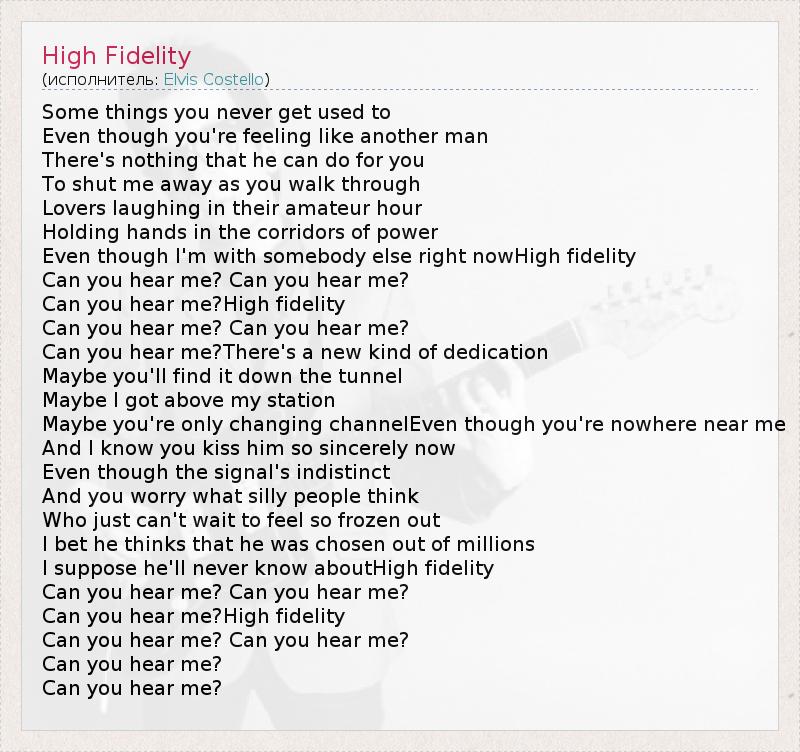 Some things you never get used to Even though you're feeling like another man There's nothing that he can do for you To shut me away as you walk through Lovers laughing in their amateur hour Holding hands in the corridors of power Even though I'm with somebody else right nowHigh fidelity Can you hear me? Can you hear me? Can you hear me?High fidelity Can you hear me? Can you hear me? Can you hear me?There's a new kind of dedication Maybe you'll find it down the tunnel Maybe I got above my station Maybe you're only changing channelEven though you're nowhere near me And I know you kiss him so sincerely now Even though the signal's indistinct And you worry what silly people think Who just can't wait to feel so frozen out I bet he thinks that he was chosen out of millions I suppose he'll never know aboutHigh fidelity Can you hear me? Can you hear me? Can you hear me?High fidelity Can you hear me? Can you hear me? Can you hear me? Can you hear me?