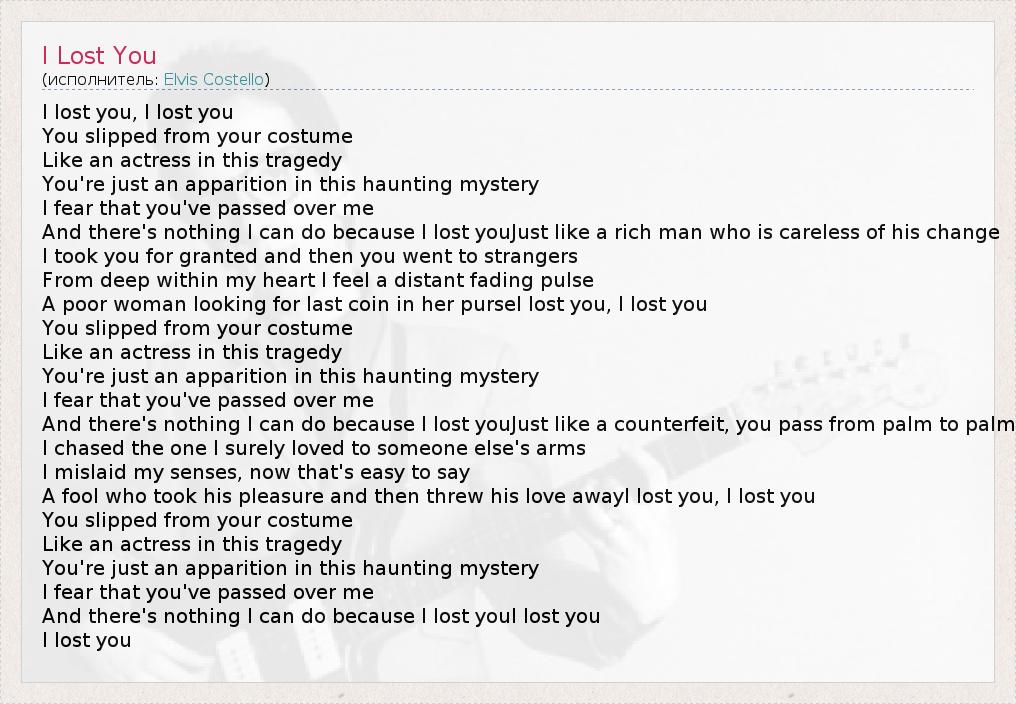 I lost you, I lost you You slipped from your costume Like an actress in this tragedy You're just an apparition in this haunting mystery I fear that you've passed over me And there's nothing I can do because I lost youJust like a rich man who is careless of his change I took you for granted and then you went to strangers From deep within my heart I feel a distant fading pulse A poor woman looking for last coin in her purseI lost you, I lost you You slipped from your costume Like an actress in this tragedy You're just an apparition in this haunting mystery I fear that you've passed over me And there's nothing I can do because I lost youJust like a counterfeit, you pass from palm to palm I chased the one I surely loved to someone else's arms I mislaid my senses, now that's easy to say A fool who took his pleasure and then threw his love awayI lost you, I lost you You slipped from your costume Like an actress in this tragedy You're just an apparition in this haunting mystery I fear that you've passed over me And there's nothing I can do because I lost youI lost you I lost you