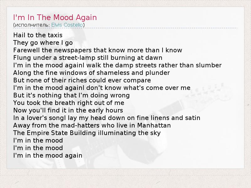 Hail to the taxis They go where I go Farewell the newspapers that know more than I know Flung under a street-lamp still burning at dawn I'm in the mood againI walk the damp streets rather than slumber Along the fine windows of shameless and plunder But none of their riches could ever compare I'm in the mood againI don't know what's come over me But it's nothing that I'm doing wrong You took the breath right out of me Now you'll find it in the early hours In a lover's songI lay my head down on fine linens and satin Away from the mad-hatters who live in Manhattan The Empire State Building illuminating the sky I'm in the mood I'm in the mood I'm in the mood again