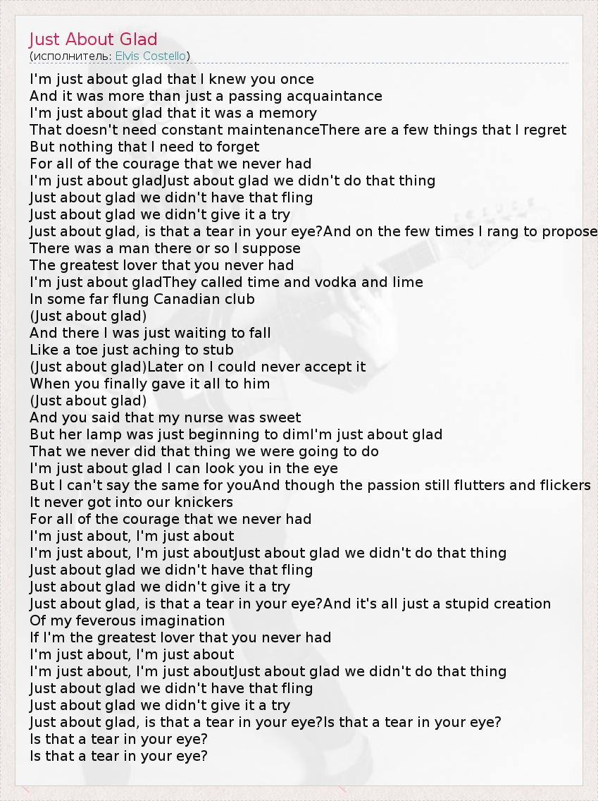 I'm just about glad that I knew you once And it was more than just a passing acquaintance I'm just about glad that it was a memory That doesn't need constant maintenanceThere are a few things that I regret But nothing that I need to forget For all of the courage that we never had I'm just about gladJust about glad we didn't do that thing Just about glad we didn't have that fling Just about glad we didn't give it a try Just about glad, is that a tear in your eye?And on the few times I rang to propose There was a man there or so I suppose The greatest lover that you never had I'm just about gladThey called time and vodka and lime In some far flung Canadian club (Just about glad) And there I was just waiting to fall Like a toe just aching to stub (Just about glad)Later on I could never accept it When you finally gave it all to him (Just about glad) And you said that my nurse was sweet But her lamp was just beginning to dimI'm just about glad That we never did that thing we were going to do I'm just about glad I can look you in the eye But I can't say the same for youAnd though the passion still flutters and flickers It never got into our knickers For all of the courage that we never had I'm just about, I'm just about I'm just about, I'm just aboutJust about glad we didn't do that thing Just about glad we didn't have that fling Just about glad we didn't give it a try Just about glad, is that a tear in your eye?And it's all just a stupid creation Of my feverous imagination If I'm the greatest lover that you never had I'm just about, I'm just about I'm just about, I'm just aboutJust about glad we didn't do that thing Just about glad we didn't have that fling Just about glad we didn't give it a try Just about glad, is that a tear in your eye?Is that a tear in your eye? Is that a tear in your eye? Is that a tear in your eye?