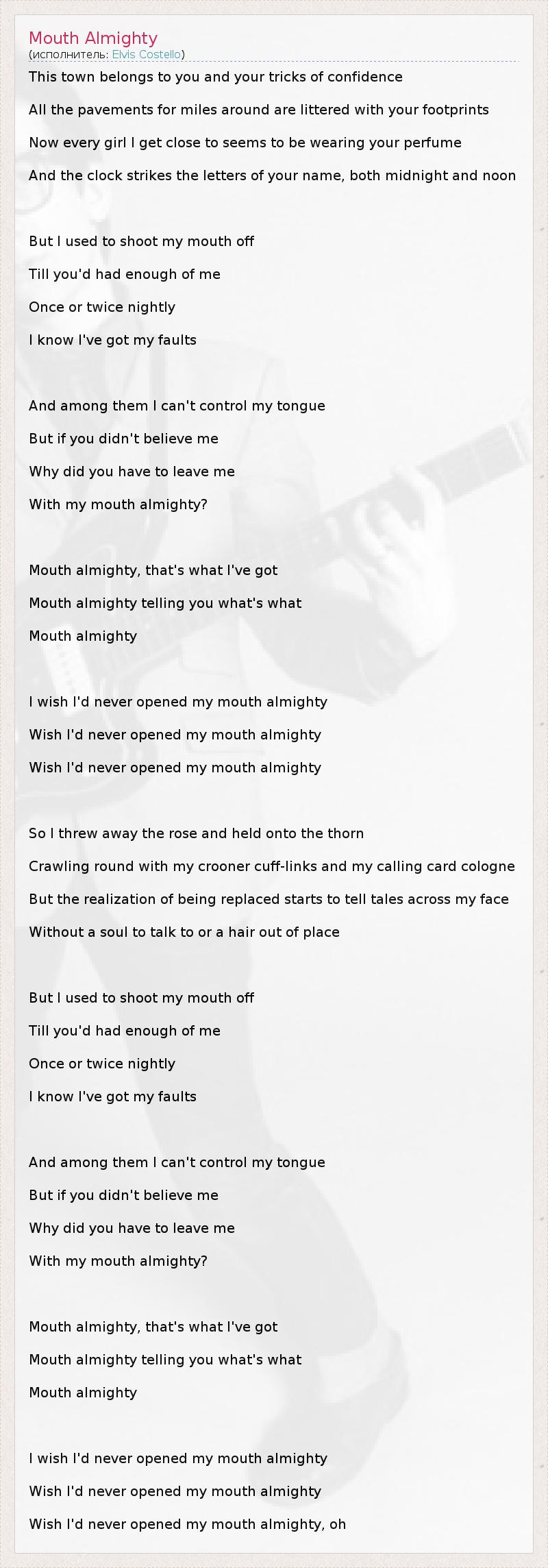 This town belongs to you and your tricks of confidence All the pavements for miles around are littered with your footprints Now every girl I get close to seems to be wearing your perfume And the clock strikes the letters of your name, both midnight and noon But I used to shoot my mouth off Till you'd had enough of me Once or twice nightly I know I've got my faults And among them I can't control my tongue But if you didn't believe me Why did you have to leave me With my mouth almighty? Mouth almighty, that's what I've got Mouth almighty telling you what's what Mouth almighty I wish I'd never opened my mouth almighty Wish I'd never opened my mouth almighty Wish I'd never opened my mouth almighty So I threw away the rose and held onto the thorn Crawling round with my crooner cuff-links and my calling card cologne But the realization of being replaced starts to tell tales across my face Without a soul to talk to or a hair out of place But I used to shoot my mouth off Till you'd had enough of me Once or twice nightly I know I've got my faults And among them I can't control my tongue But if you didn't believe me Why did you have to leave me With my mouth almighty? Mouth almighty, that's what I've got Mouth almighty telling you what's what Mouth almighty I wish I'd never opened my mouth almighty Wish I'd never opened my mouth almighty Wish I'd never opened my mouth almighty, oh