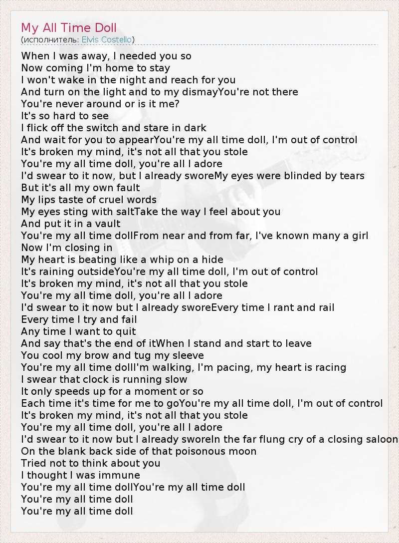 When I was away, I needed you so Now coming I'm home to stay I won't wake in the night and reach for you And turn on the light and to my dismayYou're not there You're never around or is it me? It's so hard to see I flick off the switch and stare in dark And wait for you to appearYou're my all time doll, I'm out of control It's broken my mind, it's not all that you stole You're my all time doll, you're all I adore I'd swear to it now, but I already sworeMy eyes were blinded by tears But it's all my own fault My lips taste of cruel words My eyes sting with saltTake the way I feel about you And put it in a vault You're my all time dollFrom near and from far, I've known many a girl Now I'm closing in My heart is beating like a whip on a hide It's raining outsideYou're my all time doll, I'm out of control It's broken my mind, it's not all that you stole You're my all time doll, you're all I adore I'd swear to it now but I already sworeEvery time I rant and rail Every time I try and fail Any time I want to quit And say that's the end of itWhen I stand and start to leave You cool my brow and tug my sleeve You're my all time dollI'm walking, I'm pacing, my heart is racing I swear that clock is running slow It only speeds up for a moment or so Each time it's time for me to goYou're my all time doll, I'm out of control It's broken my mind, it's not all that you stole You're my all time doll, you're all I adore I'd swear to it now but I already sworeIn the far flung cry of a closing saloon On the blank back side of that poisonous moon Tried not to think about you I thought I was immune You're my all time dollYou're my all time doll You're my all time doll You're my all time doll