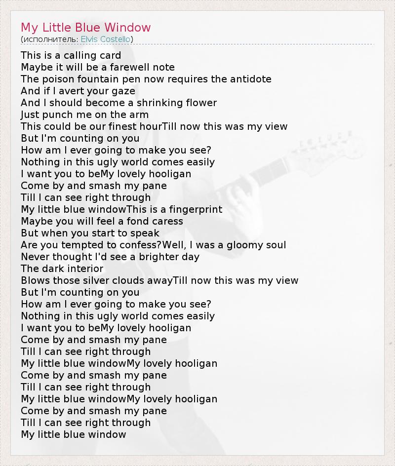 This is a calling card Maybe it will be a farewell note The poison fountain pen now requires the antidote And if I avert your gaze And I should become a shrinking flower Just punch me on the arm This could be our finest hourTill now this was my view But I'm counting on you How am I ever going to make you see? Nothing in this ugly world comes easily I want you to beMy lovely hooligan Come by and smash my pane Till I can see right through My little blue windowThis is a fingerprint Maybe you will feel a fond caress But when you start to speak Are you tempted to confess?Well, I was a gloomy soul Never thought I'd see a brighter day The dark interior Blows those silver clouds awayTill now this was my view But I'm counting on you How am I ever going to make you see? Nothing in this ugly world comes easily I want you to beMy lovely hooligan Come by and smash my pane Till I can see right through My little blue windowMy lovely hooligan Come by and smash my pane Till I can see right through My little blue windowMy lovely hooligan Come by and smash my pane Till I can see right through My little blue window