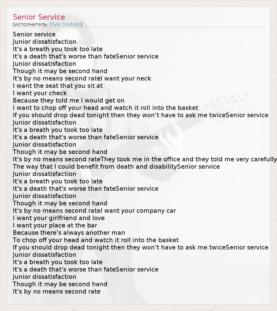 Senior service Junior dissatisfaction It's a breath you took too late It's a death that's worse than fateSenior service Junior dissatisfaction Though it may be second hand It's by no means second rateI want your neck I want the seat that you sit at I want your check Because they told me I would get on I want to chop off your head and watch it roll into the basket If you should drop dead tonight then they won't have to ask me twiceSenior service Junior dissatisfaction It's a breath you took too late It's a death that's worse than fateSenior service Junior dissatisfaction Though it may be second hand It's by no means second rateThey took me in the office and they told me very carefully The way that I could benefit from death and disabilitySenior service Junior dissatisfaction It's a breath you took too late It's a death that's worse than fateSenior service Junior dissatisfaction Though it may be second hand It's by no means second rateI want your company car I want your girlfriend and love I want your place at the bar Because there's always another man To chop off your head and watch it roll into the basket If you should drop dead tonight then they won't have to ask me twiceSenior service Junior dissatisfaction It's a breath you took too late It's a death that's worse than fateSenior service Junior dissatisfaction Though it may be second hand It's by no means second rate