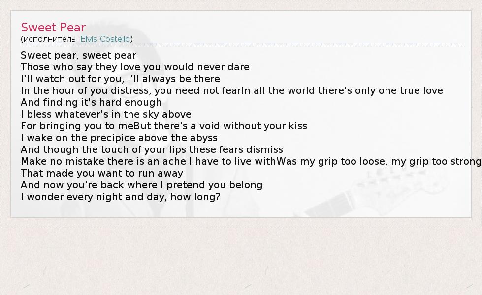 Sweet pear, sweet pear Those who say they love you would never dare I'll watch out for you, I'll always be there In the hour of you distress, you need not fearIn all the world there's only one true love And finding it's hard enough I bless whatever's in the sky above For bringing you to meBut there's a void without your kiss I wake on the precipice above the abyss And though the touch of your lips these fears dismiss Make no mistake there is an ache I have to live withWas my grip too loose, my grip too strong That made you want to run away And now you're back where I pretend you belong I wonder every night and day, how long?