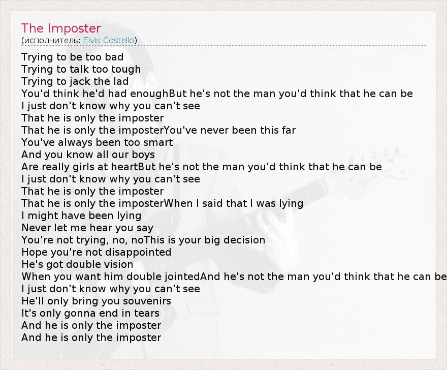 Trying to be too bad Trying to talk too tough Trying to jack the lad You'd think he'd had enoughBut he's not the man you'd think that he can be I just don't know why you can't see That he is only the imposter That he is only the imposterYou've never been this far You've always been too smart And you know all our boys Are really girls at heartBut he's not the man you'd think that he can be I just don't know why you can't see That he is only the imposter That he is only the imposterWhen I said that I was lying I might have been lying Never let me hear you say You're not trying, no, noThis is your big decision Hope you're not disappointed He's got double vision When you want him double jointedAnd he's not the man you'd think that he can be I just don't know why you can't see He'll only bring you souvenirs It's only gonna end in tears And he is only the imposter And he is only the imposter