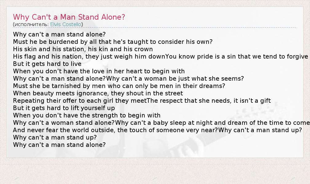 А как ты думаешь, о чем песня "Why Can't a Man Stand Alone?" ?