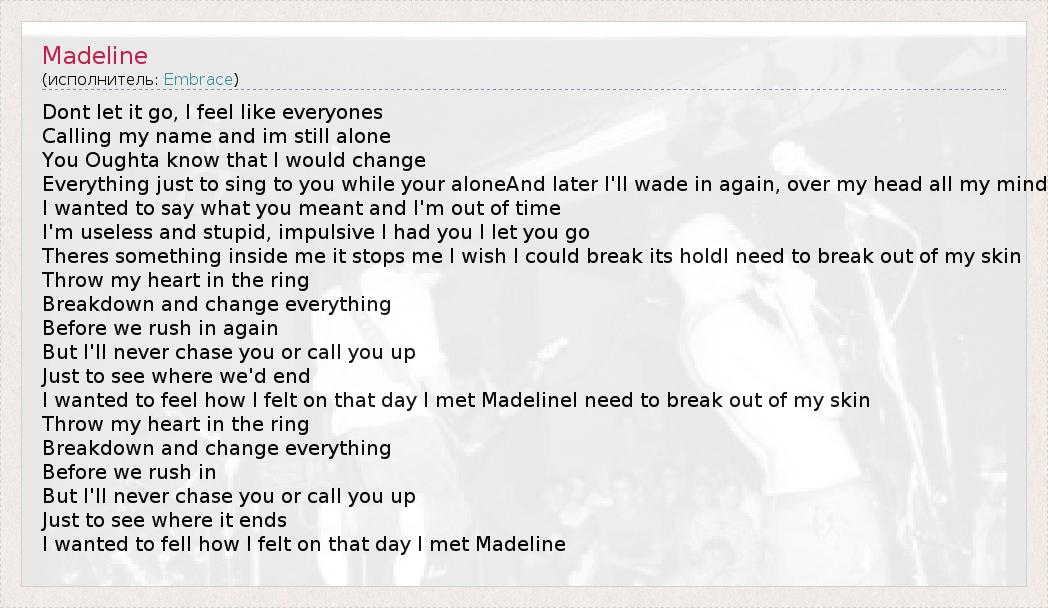 Dont let it go, I feel like everyones Calling my name and im still alone You Oughta know that I would change Everything just to sing to you while your aloneAnd later I'll wade in again, over my head all my mind I wanted to say what you meant and I'm out of time I'm useless and stupid, impulsive I had you I let you go Theres something inside me it stops me I wish I could break its holdI need to break out of my skin Throw my heart in the ring Breakdown and change everything Before we rush in again But I'll never chase you or call you up Just to see where we'd end I wanted to feel how I felt on that day I met MadelineI need to break out of my skin Throw my heart in the ring Breakdown and change everything Before we rush in But I'll never chase you or call you up Just to see where it ends I wanted to fell how I felt on that day I met Madeline