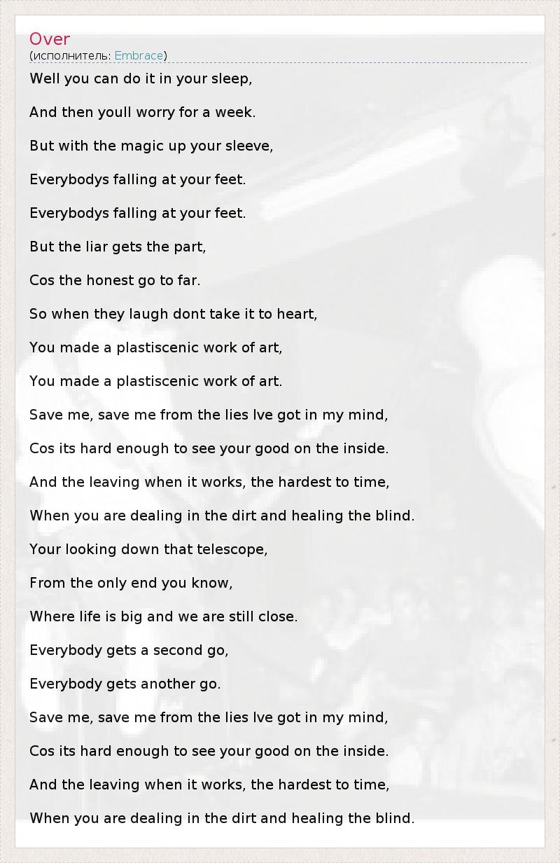 Well you can do it in your sleep, And then youll worry for a week. But with the magic up your sleeve, Everybodys falling at your feet. Everybodys falling at your feet. But the liar gets the part, Cos the honest go to far. So when they laugh dont take it to heart, You made a plastiscenic work of art, You made a plastiscenic work of art. Save me, save me from the lies Ive got in my mind, Cos its hard enough to see your good on the inside. And the leaving when it works, the hardest to time, When you are dealing in the dirt and healing the blind. Your looking down that telescope, From the only end you know, Where life is big and we are still close. Everybody gets a second go, Everybody gets another go. Save me, save me from the lies Ive got in my mind, Cos its hard enough to see your good on the inside. And the leaving when it works, the hardest to time, When you are dealing in the dirt and healing the blind.