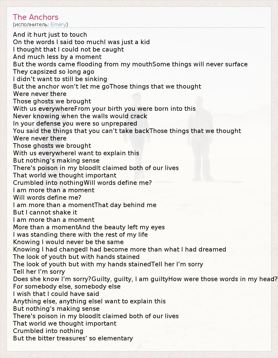 And it hurt just to touch On the words I said too muchI was just a kid I thought that I could not be caught And much less by a moment But the words came flooding from my mouthSome things will never surface They capsized so long ago I didn't want to still be sinking But the anchor won't let me goThose things that we thought Were never there Those ghosts we brought With us everywhereFrom your birth you were born into this Never knowing when the walls would crack In your defense you were so unprepared You said the things that you can't take backThose things that we thought Were never there Those ghosts we brought With us everywhereI want to explain this But nothing's making sense There's poison in my bloodIt claimed both of our lives That world we thought important Crumbled into nothingWill words define me? I am more than a moment Will words define me? I am more than a momentThat day behind me But I cannot shake it I am more than a moment More than a momentAnd the beauty left my eyes I was standing there with the rest of my life Knowing I would never be the same Knowing I had changedI had become more than what I had dreamed The look of youth but with hands stained The look of youth but with my hands stainedTell her I'm sorry Tell her I'm sorry Does she know I'm sorry?Guilty, guilty, I am guiltyHow were those words in my head? For somebody else, somebody else I wish that I could have said Anything else, anything elseI want to explain this But nothing's making sense There's poison in my bloodIt claimed both of our lives That world we thought important Crumbled into nothing But the bitter treasures' so elementary