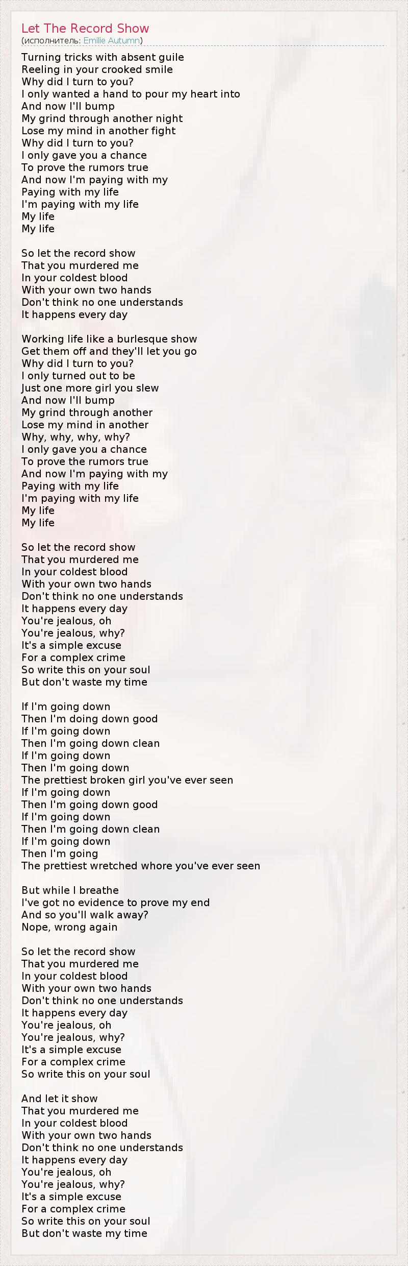 Turning tricks with absent guile Reeling in your crooked smile Why did I turn to you? I only wanted a hand to pour my heart into And now I'll bump My grind through another night Lose my mind in another fight Why did I turn to you? I only gave you a chance To prove the rumors true And now I'm paying with my Paying with my life I'm paying with my life My life My life So let the record show That you murdered me In your coldest blood With your own two hands Don't think no one understands It happens every day Working life like a burlesque show Get them off and they'll let you go Why did I turn to you? I only turned out to be Just one more girl you slew And now I'll bump My grind through another Lose my mind in another Why, why, why, why? I only gave you a chance To prove the rumors true And now I'm paying with my Paying with my life I'm paying with my life My life My life So let the record show That you murdered me In your coldest blood With your own two hands Don't think no one understands It happens every day You're jealous, oh You're jealous, why? It's a simple excuse For a complex crime So write this on your soul But don't waste my time If I'm going down Then I'm doing down good If I'm going down Then I'm going down clean If I'm going down Then I'm going down The prettiest broken girl you've ever seen If I'm going down Then I'm going down good If I'm going down Then I'm going down clean If I'm going down Then I'm going The prettiest wretched whore you've ever seen But while I breathe I've got no evidence to prove my end And so you'll walk away? Nope, wrong again So let the record show That you murdered me In your coldest blood With your own two hands Don't think no one understands It happens every day You're jealous, oh You're jealous, why? It's a simple excuse For a complex crime So write this on your soul And let it show That you murdered me In your coldest blood With your own two hands Don't think no one understands It happens every day You're jealous, oh You're jealous, why? It's a simple excuse For a complex crime So write this on your soul But don't waste my time
