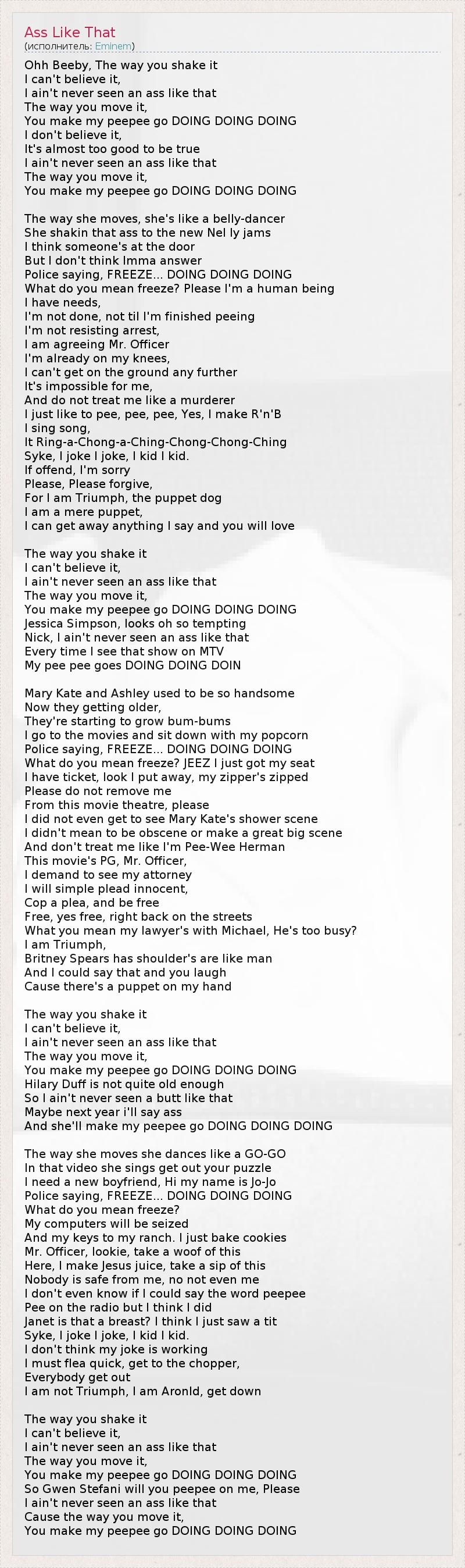Ohh Beeby, The way you shake it I can't believe it, I ain't never seen an ass like that The way you move it, You make my peepee go DOING DOING DOING I don't believe it, It's almost too good to be true I ain't never seen an ass like that The way you move it, You make my peepee go DOING DOING DOING The way she moves, she's like a belly-dancer She shakin that ass to the new Nel ly jams I think someone's at the door But I don't think Imma answer Police saying, FREEZE... DOING DOING DOING What do you mean freeze? Please I'm a human being I have needs, I'm not done, not til I'm finished peeing I'm not resisting arrest, I am agreeing Mr. Officer I'm already on my knees, I can't get on the ground any further It's impossible for me, And do not treat me like a murderer I just like to pee, pee, pee, Yes, I make R'n'B I sing song, It Ring-a-Chong-a-Ching-Chong-Chong-Ching Syke, I joke I joke, I kid I kid. If offend, I'm sorry Please, Please forgive, For I am Triumph, the puppet dog I am a mere puppet, I can get away anything I say and you will love The way you shake it I can't believe it, I ain't never seen an ass like that The way you move it, You make my peepee go DOING DOING DOING Jessica Simpson, looks oh so tempting Nick, I ain't never seen an ass like that Every time I see that show on MTV My pee pee goes DOING DOING DOIN Mary Kate and Ashley used to be so handsome Now they getting older, They're starting to grow bum-bums I go to the movies and sit down with my popcorn Police saying, FREEZE... DOING DOING DOING What do you mean freeze? JEEZ I just got my seat I have ticket, look I put away, my zipper's zipped Please do not remove me From this movie theatre, please I did not even get to see Mary Kate's shower scene I didn't mean to be obscene or make a great big scene And don't treat me like I'm Pee-Wee Herman This movie's PG, Mr. Officer, I demand to see my attorney I will simple plead innocent, Cop a plea, and be free Free, yes free, right back on the streets What you mean my lawyer's with Michael, He's too busy? I am Triumph, Britney Spears has shoulder's are like man And I could say that and you laugh Cause there's a puppet on my hand The way you shake it I can't believe it, I ain't never seen an ass like that The way you move it, You make my peepee go DOING DOING DOING Hilary Duff is not quite old enough So I ain't never seen a butt like that Maybe next year i'll say ass And she'll make my peepee go DOING DOING DOING The way she moves she dances like a GO-GO In that video she sings get out your puzzle I need a new boyfriend, Hi my name is Jo-Jo Police saying, FREEZE... DOING DOING DOING What do you mean freeze? My computers will be seized And my keys to my ranch. I just bake cookies Mr. Officer, lookie, take a woof of this Here, I make Jesus juice, take a sip of this Nobody is safe from me, no not even me I don't even know if I could say the word peepee Pee on the radio but I think I did Janet is that a breast? I think I just saw a tit Syke, I joke I joke, I kid I kid. I don't think my joke is working I must flea quick, get to the chopper, Everybody get out I am not Triumph, I am Aronld, get down The way you shake it I can't believe it, I ain't never seen an ass like that The way you move it, You make my peepee go DOING DOING DOING So Gwen Stefani will you peepee on me, Please I ain't never seen an ass like that Cause the way you move it, You make my peepee go DOING DOING DOING