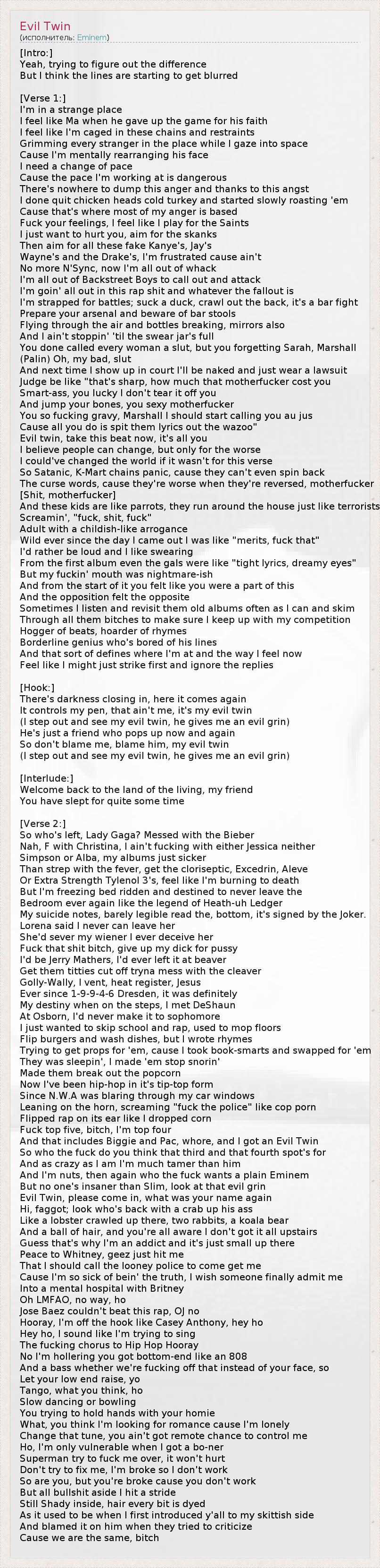 * Фраза из "Kill You", 'A blood stain is orange after you wash it three or four times in the tub / But that’s normal, ain’t it Norman?' — намек на Нормана Бэйтса (Norman Bates), убийцу из фильма Психо.