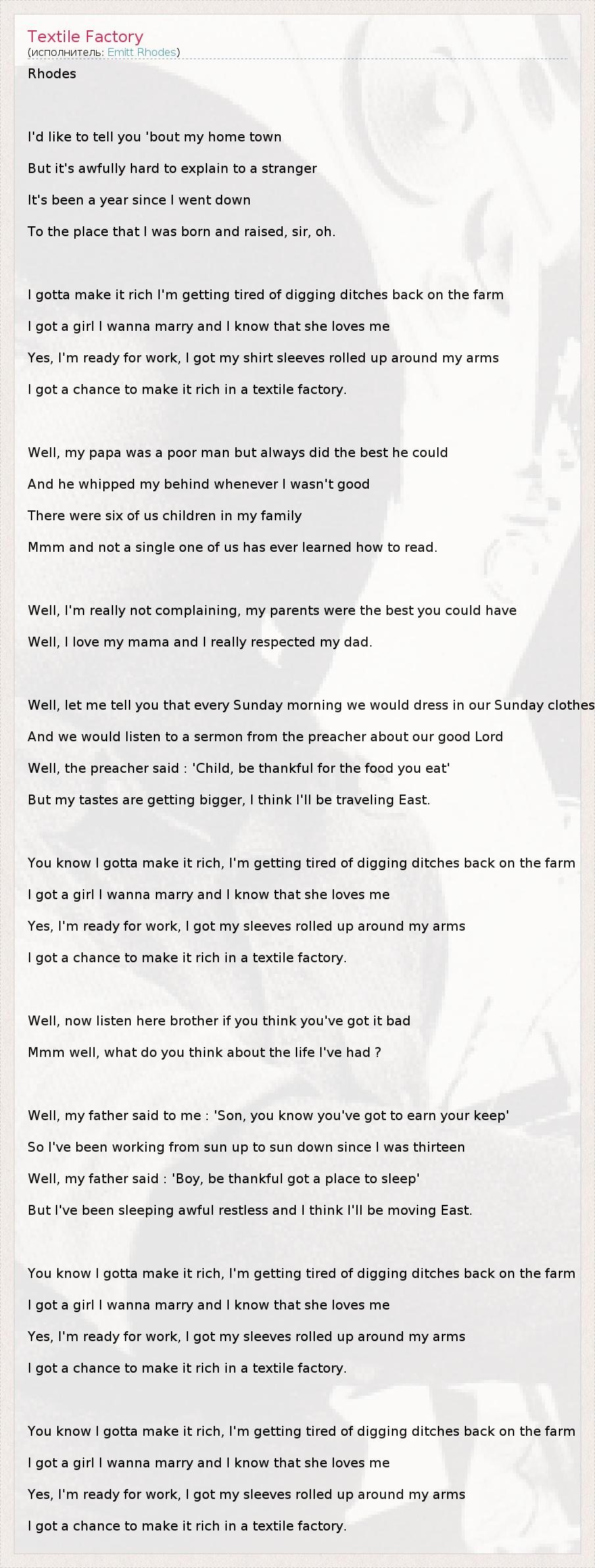 Rhodes I'd like to tell you 'bout my home town But it's awfully hard to explain to a stranger It's been a year since I went down To the place that I was born and raised, sir, oh. I gotta make it rich I'm getting tired of digging ditches back on the farm I got a girl I wanna marry and I know that she loves me Yes, I'm ready for work, I got my shirt sleeves rolled up around my arms I got a chance to make it rich in a textile factory. Well, my papa was a poor man but always did the best he could And he whipped my behind whenever I wasn't good There were six of us children in my family Mmm and not a single one of us has ever learned how to read. Well, I'm really not complaining, my parents were the best you could have Well, I love my mama and I really respected my dad. Well, let me tell you that every Sunday morning we would dress in our Sunday clothes And we would listen to a sermon from the preacher about our good Lord Well, the preacher said : 'Child, be thankful for the food you eat' But my tastes are getting bigger, I think I'll be traveling East. You know I gotta make it rich, I'm getting tired of digging ditches back on the farm I got a girl I wanna marry and I know that she loves me Yes, I'm ready for work, I got my sleeves rolled up around my arms I got a chance to make it rich in a textile factory. Well, now listen here brother if you think you've got it bad Mmm well, what do you think about the life I've had ? Well, my father said to me : 'Son, you know you've got to earn your keep' So I've been working from sun up to sun down since I was thirteen Well, my father said : 'Boy, be thankful got a place to sleep' But I've been sleeping awful restless and I think I'll be moving East. You know I gotta make it rich, I'm getting tired of digging ditches back on the farm I got a girl I wanna marry and I know that she loves me Yes, I'm ready for work, I got my sleeves rolled up around my arms I got a chance to make it rich in a textile factory. You know I gotta make it rich, I'm getting tired of digging ditches back on the farm I got a girl I wanna marry and I know that she loves me Yes, I'm ready for work, I got my sleeves rolled up around my arms I got a chance to make it rich in a textile factory.