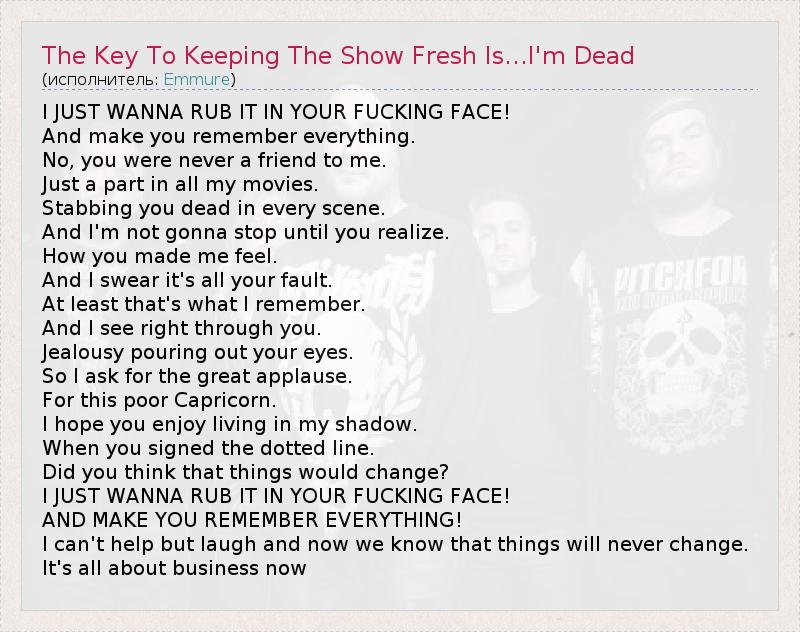А как ты думаешь, о чем песня "The Key To Keeping The Show Fresh Is...I'm Dead" ?