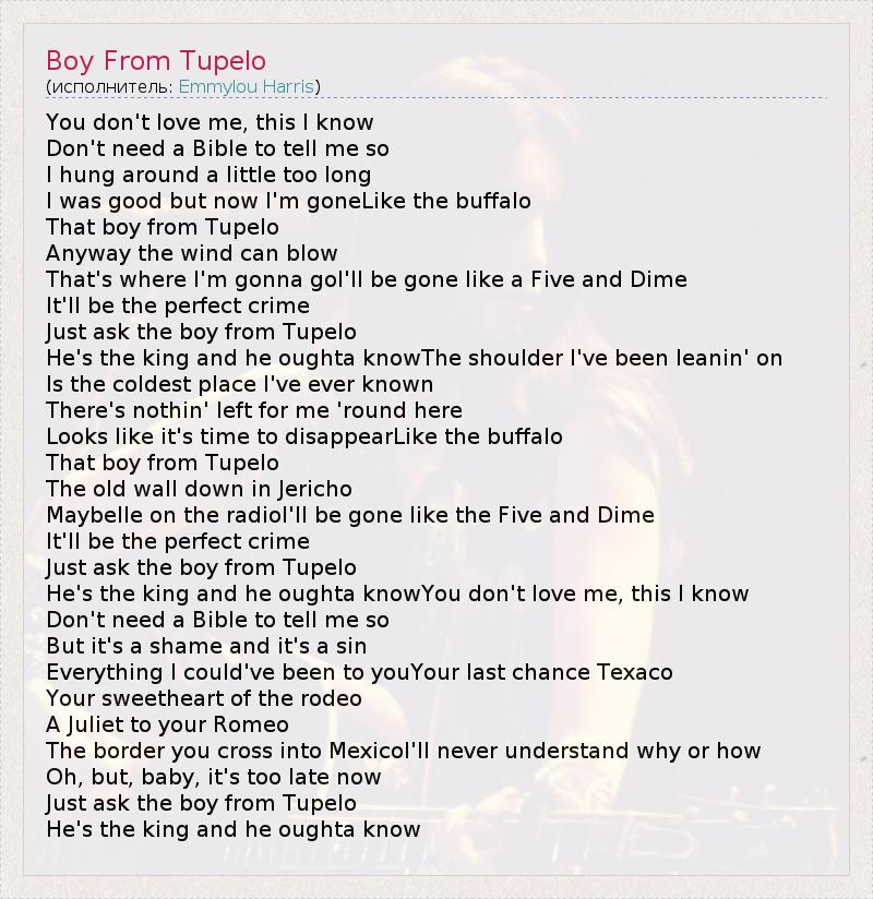 А как ты думаешь, о чем песня "Boy From Tupelo" ?