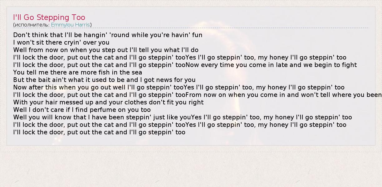 Don't think that I'll be hangin' 'round while you're havin' fun I won't sit there cryin' over you Well from now on when you step out I'll tell you what I'll do I'll lock the door, put out the cat and I'll go steppin' tooYes I'll go steppin' too, my honey I'll go steppin' too I'll lock the door, put out the cat and I'll go steppin' tooNow every time you come in late and we begin to fight You tell me there are more fish in the sea But the bait ain't what it used to be and I got news for you Now after this when you go out well I'll go steppin' tooYes I'll go steppin' too, my honey I'll go steppin' too I'll lock the door, put out the cat and I'll go steppin' tooFrom now on when you come in and won't tell where you been With your hair messed up and your clothes don't fit you right Well I don't care if I find perfume on you too Well you will know that I have been steppin' just like youYes I'll go steppin' too, my honey I'll go steppin' too I'll lock the door, put out the cat and I'll go steppin' tooYes I'll go steppin' too, my honey I'll go steppin' too I'll lock the door, put out the cat and I'll go steppin' too