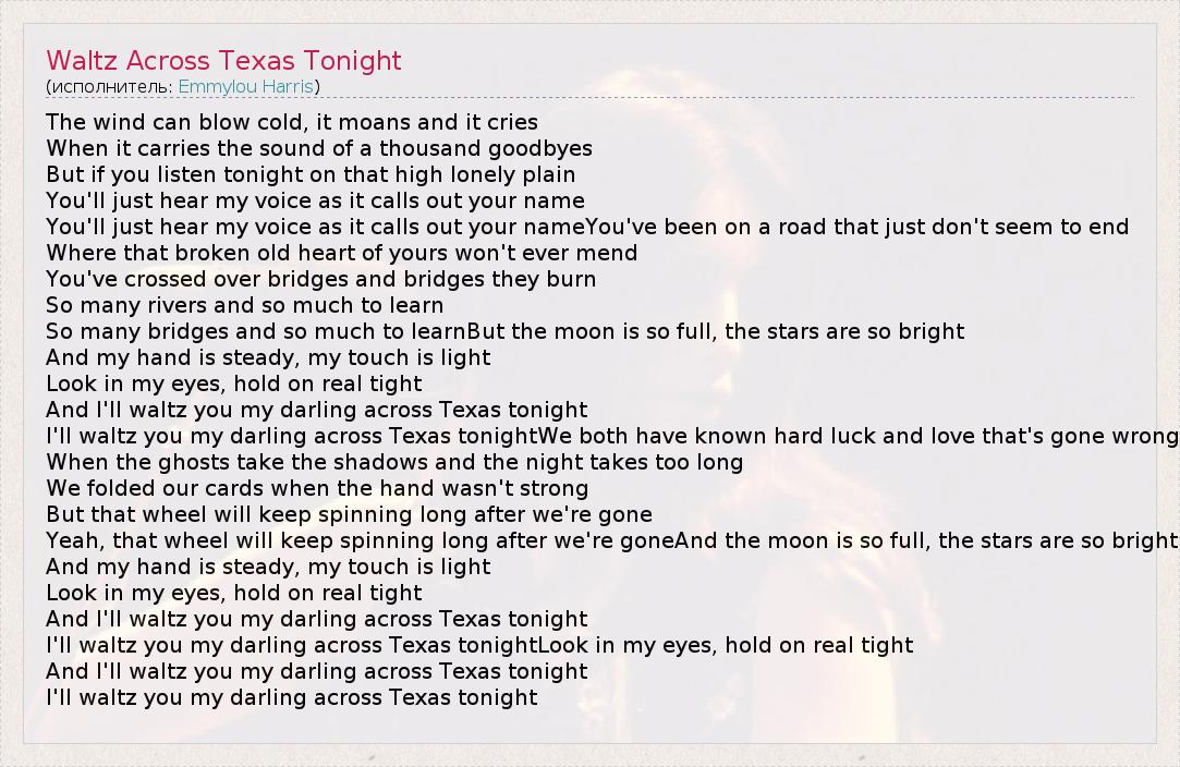 А как ты думаешь, о чем песня "Waltz Across Texas Tonight" ?
