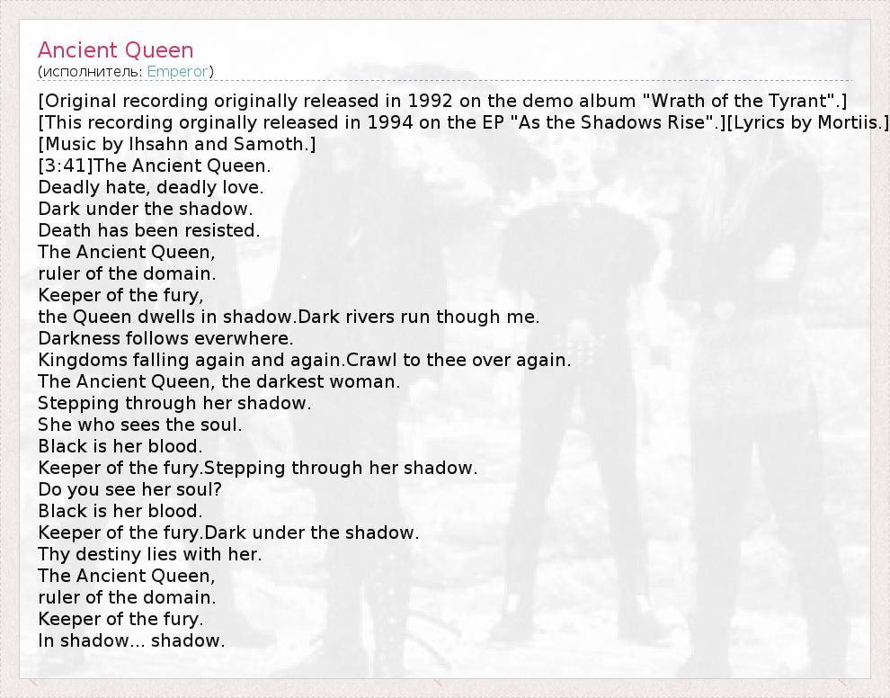 А как ты думаешь, о чем песня "Ancient Queen" ?