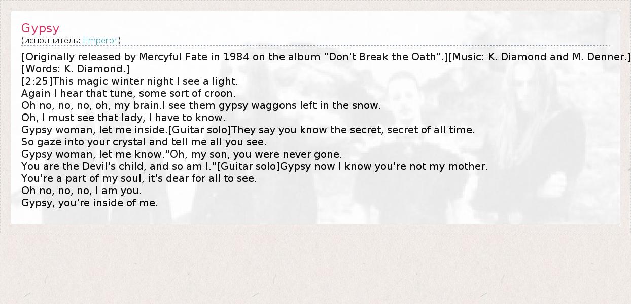 You are the Devil's child, and so am I."[Guitar solo]Gypsy now I know you're not my mother.