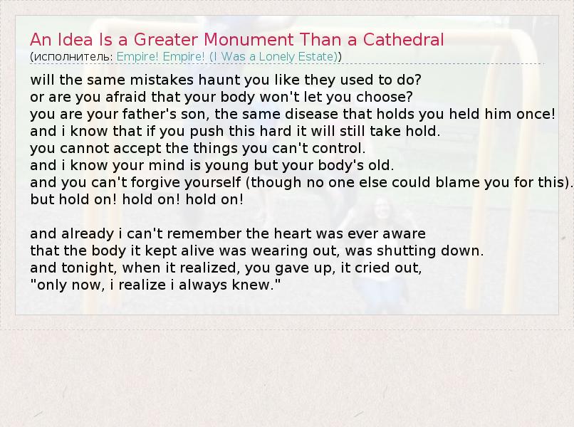 А как ты думаешь, о чем песня "An Idea Is a Greater Monument Than a Cathedral" ?