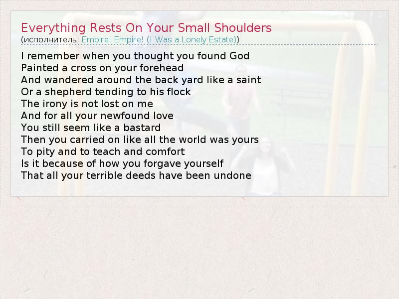А как ты думаешь, о чем песня "Everything Rests On Your Small Shoulders" ?