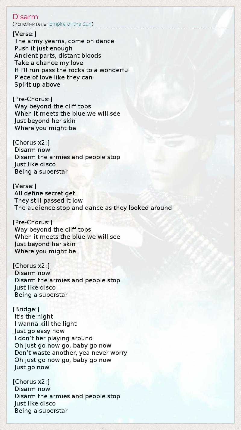 [Куплет:] Армия тоскует, давайте потанцуем Подтолкни ее разок Древние части, дальняя кровь Рискни, моя любовь Пересеку ли я скалы на пути к чудесной Частичке любви, какой они могут быть Пусть душа взмывает в небеса [Пред-припев:] За вершины скал Когда мы встретимся с небом, мы поймем Что способны дотянуться до Края мира [Припев x2:] Разоружайтесь Разоружите армии, и люди остановятся Так же, как дискотека Будьте суперзвездой [Куплет:] Все хотят докопаться до истины Но они упускают то, что Пока они смотрят по сторонам, публика останавливается и танцует [Пред-припев:] За вершины скал Когда мы встретимся с небом, мы поймем Что способны дотянуться до Края мира [Припев x2:] Разоружайтесь Разоружите армии, и люди остановятся Так же, как дискотека Будьте суперзвездой [Переход: ] Ночь Я хочу убить свет Просто расслабьтесь Я не играю с ней О, просто подходи, вперед, малышка Не трать впустую еще одну ночь, никогда не переживай О, просто подходи, и вперед, малышка Просто вперед [Припев x2:] Разоружайтесь Разоружите армии, и люди остановятся Так же, как дискотека Будьте суперзвездой