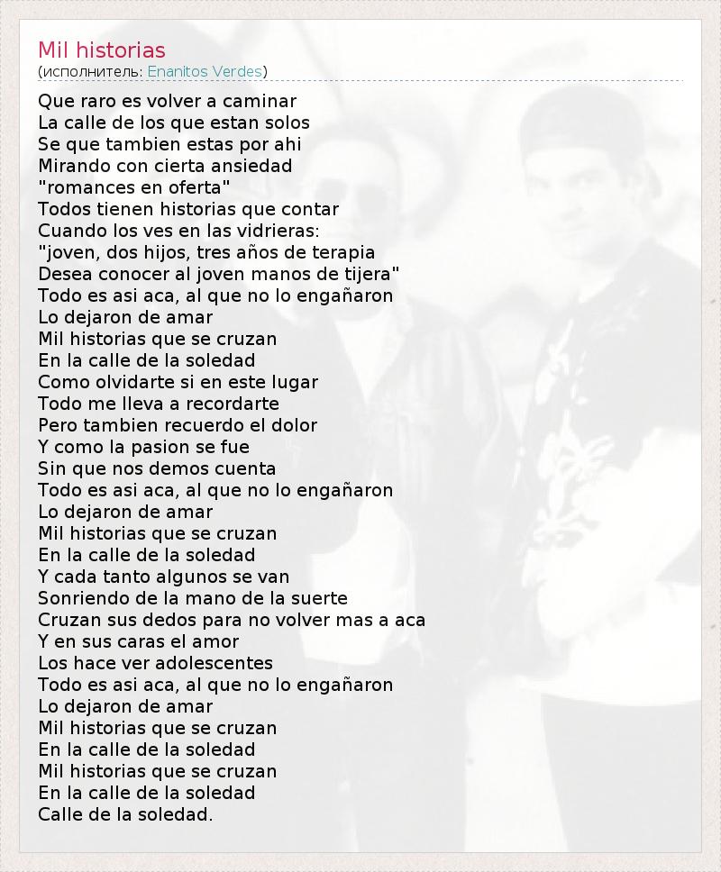 Это интересно:Enanitos Verdes, иногда "Los Enanitos Verdes" - переводится как "маленькие зелёные гномы (карлики, мужчины)" - успешная аргентинская рок-группа (трио), образованная в 1979 году в городе Мендоса. На протяжении своей карьеры, они не раз занимали самые высокие места в аргентинских хит-парадах.Первоначальный состав (до 1984 года) - Marciano Cantero, Felipe Staiti, Daniel Piccolo. На творчество Marciano Cantero сильно повлияли... продолжение