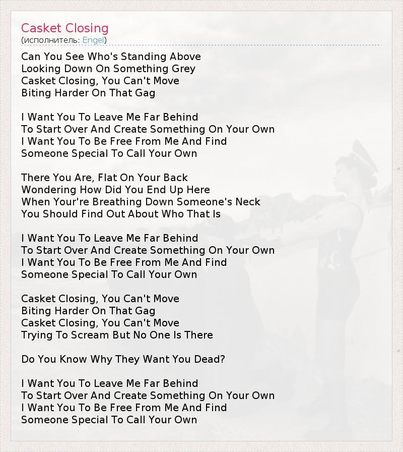 Can You See Who's Standing Above Looking Down On Something Grey Casket Closing, You Can't Move Biting Harder On That Gag I Want You To Leave Me Far Behind To Start Over And Create Something On Your Own I Want You To Be Free From Me And Find Someone Special To Call Your Own There You Are, Flat On Your Back Wondering How Did You End Up Here When Your're Breathing Down Someone's Neck You Should Find Out About Who That Is I Want You To Leave Me Far Behind To Start Over And Create Something On Your Own I Want You To Be Free From Me And Find Someone Special To Call Your Own Casket Closing, You Can't Move Biting Harder On That Gag Casket Closing, You Can't Move Trying To Scream But No One Is There Do You Know Why They Want You Dead? I Want You To Leave Me Far Behind To Start Over And Create Something On Your Own I Want You To Be Free From Me And Find Someone Special To Call Your Own