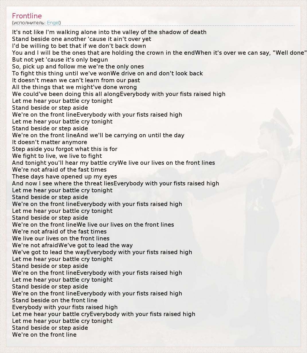 It's not like I'm walking alone into the valley of the shadow of death Stand beside one another 'cause it ain't over yet I'd be willing to bet that if we don't back down You and I will be the ones that are holding the crown in the endWhen it's over we can say, "Well done" But not yet 'cause it's only begun So, pick up and follow me we're the only ones To fight this thing until we've wonWe drive on and don't look back It doesn't mean we can't learn from our past All the things that we might've done wrong We could've been doing this all alongEverybody with your fists raised high Let me hear your battle cry tonight Stand beside or step aside We're on the front lineEverybody with your fists raised high Let me hear your battle cry tonight Stand beside or step aside We're on the front lineAnd we'll be carrying on until the day It doesn't matter anymore Step aside you forgot what this is for We fight to live, we live to fight And tonight you'll hear my battle cryWe live our lives on the front lines We're not afraid of the fast times These days have opened up my eyes And now I see where the threat liesEverybody with your fists raised high Let me hear your battle cry tonight Stand beside or step aside We're on the front lineEverybody with your fists raised high Let me hear your battle cry tonight Stand beside or step aside We're on the front lineWe live our lives on the front lines We're not afraid of the fast times We live our lives on the front lines We're not afraidWe've got to lead the way We've got to lead the wayEverybody with your fists raised high Let me hear your battle cry tonight Stand beside or step aside We're on the front lineEverybody with your fists raised high Let me hear your battle cry tonight Stand beside or step aside We're on the front lineEverybody with your fists raised high Stand beside on the front line Everybody with your fists raised high Let me hear your battle cryEverybody with your fists raised high Let me hear your battle cry tonight Stand beside or step aside We're on the front line