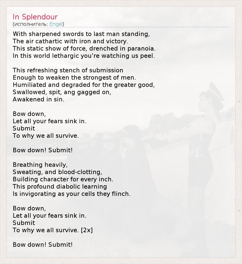 With sharpened swords to last man standing, The air cathartic with iron and victory. This static show of force, drenched in paranoia. In this world lethargic you're watching us peel. This refreshing stench of submission Enough to weaken the strongest of men. Humiliated and degraded for the greater good, Swallowed, spit, ang gagged on, Awakened in sin. Bow down, Let all your fears sink in. Submit To why we all survive. Bow down! Submit! Breathing heavily, Sweating, and blood-clotting, Building character for every inch. This profound diabolic learning Is invigorating as your cells they flinch. Bow down, Let all your fears sink in. Submit To why we all survive. [2x] Bow down! Submit!
