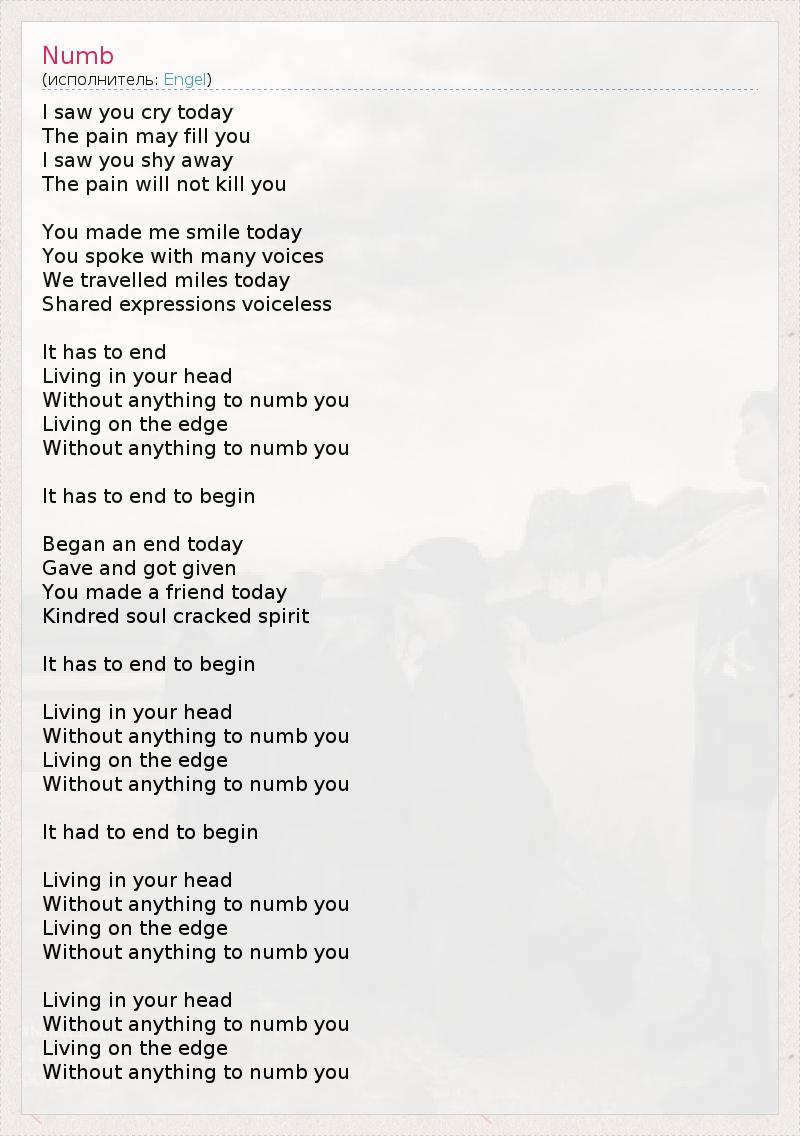 I saw you cry today The pain may fill you I saw you shy away The pain will not kill you You made me smile today You spoke with many voices We travelled miles today Shared expressions voiceless It has to end Living in your head Without anything to numb you Living on the edge Without anything to numb you It has to end to begin Began an end today Gave and got given You made a friend today Kindred soul cracked spirit It has to end to begin Living in your head Without anything to numb you Living on the edge Without anything to numb you It had to end to begin Living in your head Without anything to numb you Living on the edge Without anything to numb you Living in your head Without anything to numb you Living on the edge Without anything to numb you