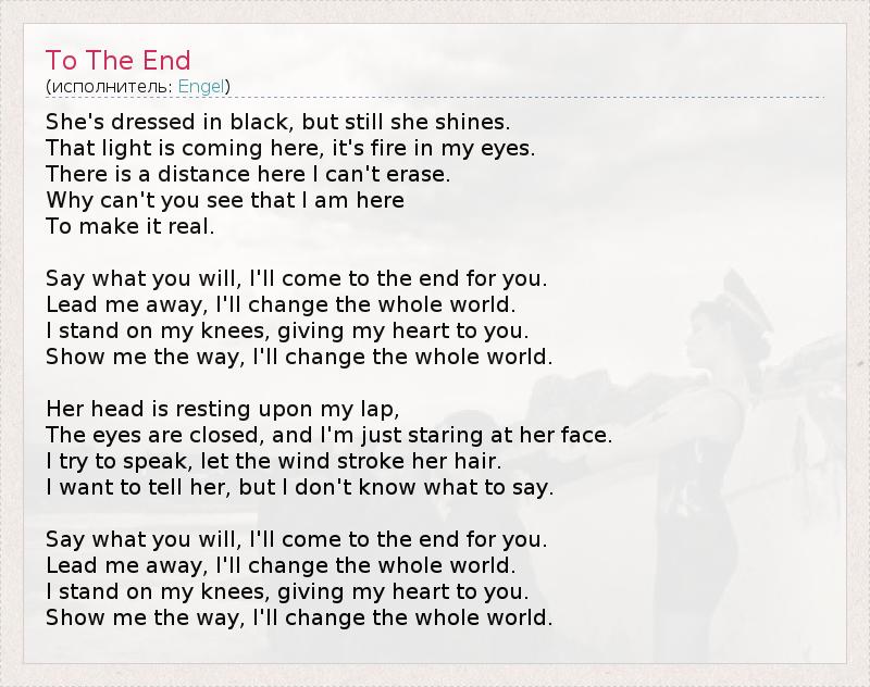 She's dressed in black, but still she shines. That light is coming here, it's fire in my eyes. There is a distance here I can't erase. Why can't you see that I am here To make it real. Say what you will, I'll come to the end for you. Lead me away, I'll change the whole world. I stand on my knees, giving my heart to you. Show me the way, I'll change the whole world. Her head is resting upon my lap, The eyes are closed, and I'm just staring at her face. I try to speak, let the wind stroke her hair. I want to tell her, but I don't know what to say. Say what you will, I'll come to the end for you. Lead me away, I'll change the whole world. I stand on my knees, giving my heart to you. Show me the way, I'll change the whole world.