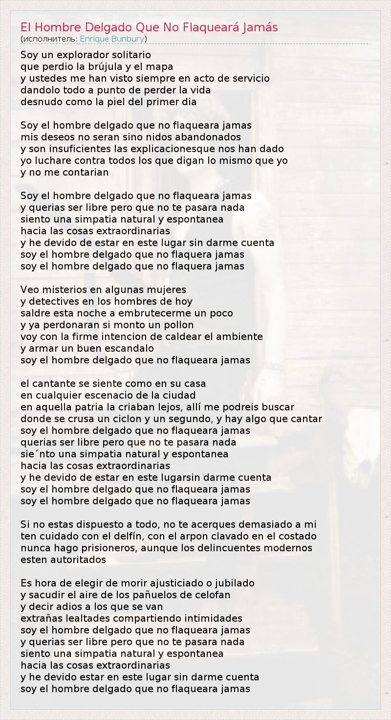 Soy un explorador solitario que perdio la brújula y el mapa y ustedes me han visto siempre en acto de servicio dandolo todo a punto de perder la vida desnudo como la piel del primer dia Soy el hombre delgado que no flaqueara jamas mis deseos no seran sino nidos abandonados y son insuficientes las explicacionesque nos han dado yo luchare contra todos los que digan lo mismo que yo y no me contarian Soy el hombre delgado que no flaqueara jamas y querias ser libre pero que no te pasara nada siento una simpatia natural y espontanea hacia las cosas extraordinarias y he devido de estar en este lugar sin darme cuenta soy el hombre delgado que no flaquera jamas soy el hombre delgado que no flaquera jamas Veo misterios en algunas mujeres y detectives en los hombres de hoy saldre esta noche a embrutecerme un poco y ya perdonaran si monto un pollon voy con la firme intencion de caldear el ambiente y armar un buen escandalo soy el hombre delgado que no flaqueara jamas el cantante se siente como en su casa en cualquier escenacio de la ciudad en aquella patria la criaban lejos, allí me podreis buscar donde se crusa un ciclon y un segundo, y hay algo que cantar soy el hombre delgado que no flaqueara jamas querias ser libre pero que no te pasara nada sie´nto una simpatia natural y espontanea hacia las cosas extraordinarias y he devido de estar en este lugarsin darme cuenta soy el hombre delgado que no flaqueara jamas soy el hombre delgado que no flaqueara jamas Si no estas dispuesto a todo, no te acerques demasiado a mi ten cuidado con el delfín, con el arpon clavado en el costado nunca hago prisioneros, aunque los delincuentes modernos esten autoritados Es hora de elegir de morir ajusticiado o jubilado y sacudir el aire de los pañuelos de celofan y decir adios a los que se van extrañas lealtades compartiendo intimidades soy el hombre delgado que no flaqueara jamas y querias ser libre pero que no te pasara nada siento una simpatia natural y espontanea hacia las cosas extraordinarias y he devido estar en este lugar sin darme cuenta soy el hombre delgado que no flaqueara jamas