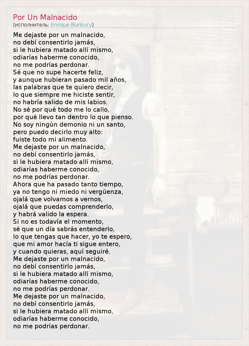 Me dejaste por un malnacido, no debí consentirlo jamás, si le hubiera matado allí mismo, odiarías haberme conocido, no me podrías perdonar. Sé que no supe hacerte feliz, y aunque hubieran pasado mil años, las palabras que te quiero decir, lo que siempre me hiciste sentir, no habría salido de mis labios. No sé por qué todo me lo callo, por qué llevo tan dentro lo que pienso. No soy ningún demonio ni un santo, pero puedo decirlo muy alto: fuiste todo mi alimento. Me dejaste por un malnacido, no debí consentirlo jamás, si le hubiera matado allí mismo, odiarías haberme conocido, no me podrías perdonar. Ahora que ha pasado tanto tiempo, ya no tengo ni miedo ni vergüenza, ojalá que volvamos a vernos, ojalá que puedas comprenderlo, y habrá valido la espera. Si no es todavía el momento, sé que un día sabrás entenderlo, lo que tengas que hacer, yo te espero, que mi amor hacía ti sigue entero, y cuando quieras, aquí seguiré. Me dejaste por un malnacido, no debí consentirlo jamás, si le hubiera matado allí mismo, odiarías haberme conocido, no me podrías perdonar. Me dejaste por un malnacido, no debí consentirlo jamás, si le hubiera matado allí mismo, odiarías haberme conocido, no me podrías perdonar.