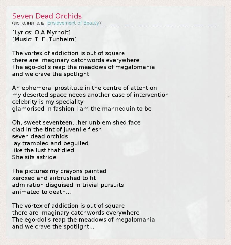 А как ты думаешь, о чем песня "Seven Dead Orchids" ?