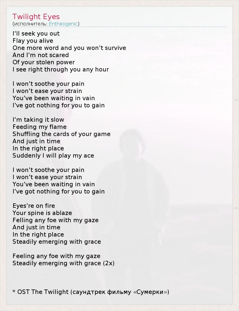 I'll seek you out Flay you alive One more word and you won't survive And I'm not scared Of your stolen power I see right through you any hour I won't soothe your pain I won't ease your strain You've been waiting in vain I've got nothing for you to gain I'm taking it slow Feeding my flame Shuffling the cards of your game And just in time In the right place Suddenly I will play my ace I won't soothe your pain I won't ease your strain You've been waiting in vain I've got nothing for you to gain Eyes're on fire Your spine is ablaze Felling any foe with my gaze And just in time In the right place Steadily emerging with grace Feeling any foe with my gaze Steadily emerging with grace (2x) * OST The Twilight (саундтрек фильму «Сумерки»)