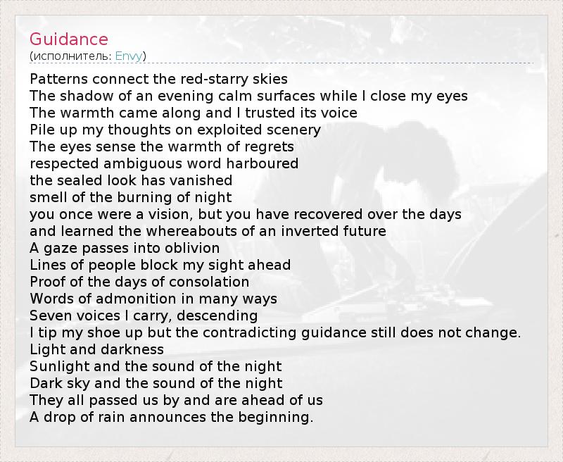 Recitation is the fifth album from Envy. Recitation continues to expand upon the band's previous albums by using further elements of post-rock and spoken word while also maintaining screamed vocals, and is often seen as an album of further growth for Envy that improves upon the predecessors by perfecting their mix of screamo, hardcore punk and post-rock. They also continue to use Japanese lyrics.